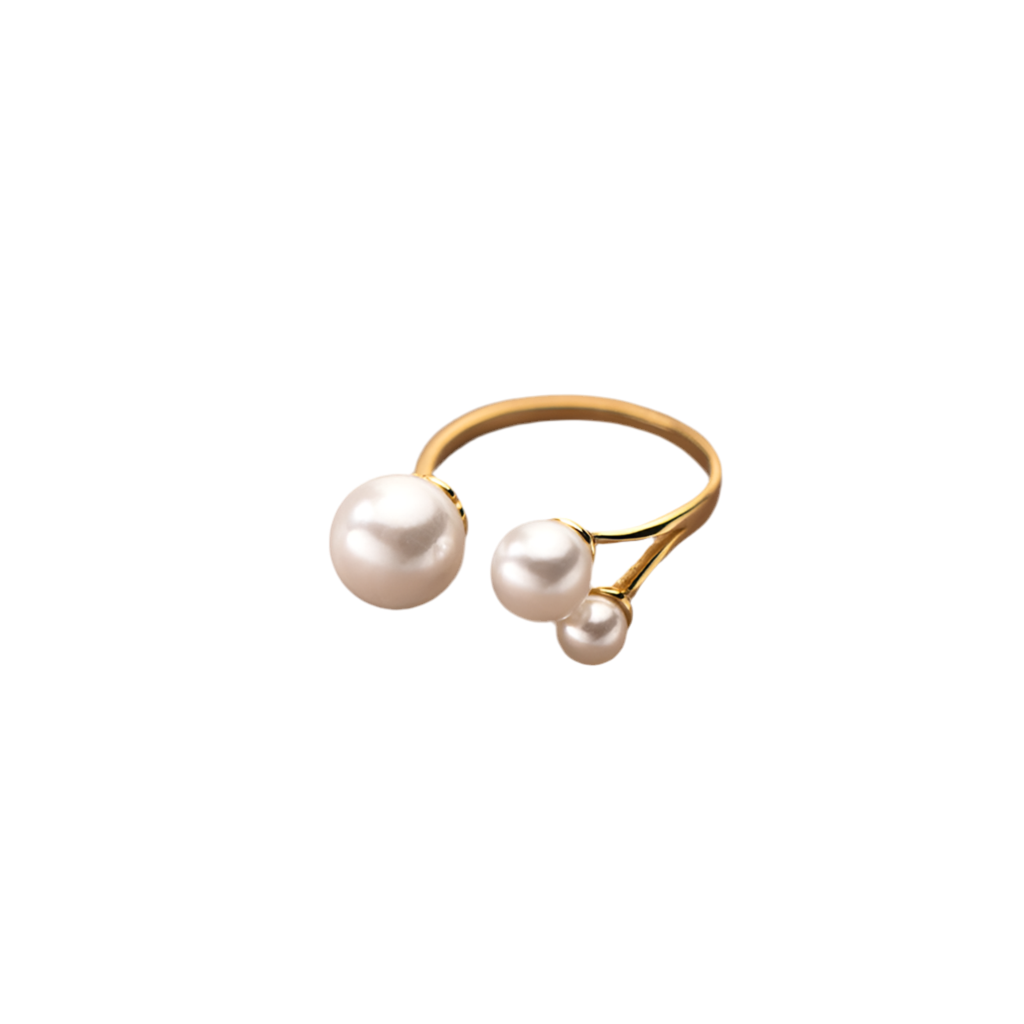 Låt dina händer stråla med denna förfinade ring, dekorerad med tre glänsande pärlor i olika storlekar. Den eleganta designen kombinerar tidlös klass med en modern twist, vilket gör detta smycke perfekt för både vardagsbruk och speciella tillfällen.