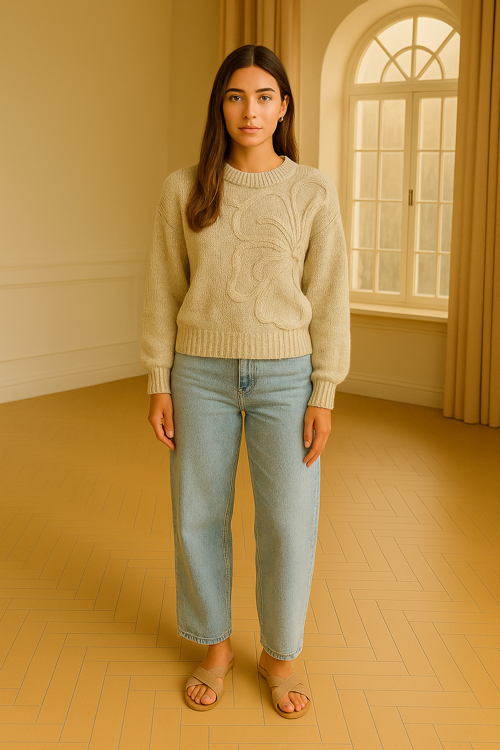 Denna beiga stickade tröja är en mjuk och stilfull must-have. Den lösa modellen med rund hals ger en bekväm passform, medan det invävda blommotivet framtill skapar ett unikt och elegant uttryck.