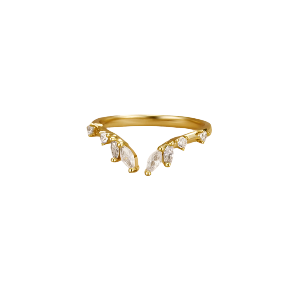En elegant ring som utstrålar lyx och förfining. Denna guldfärgade ring är dekorerad med gnistrande marquiseslipade stenar som tillsammans bildar ett subtilt bladmotiv. Den öppna V-formen ger en modern touch och gör att ringen faller vackert runt fingret.