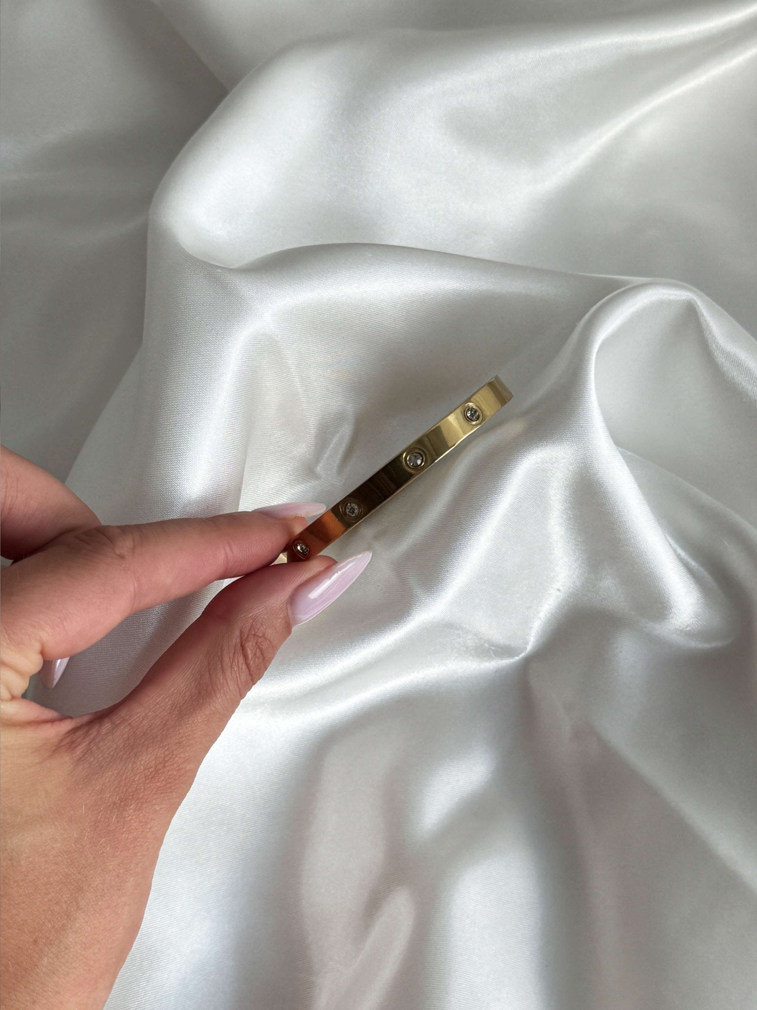 Detta eleganta set med två guldfärgade armband kombinerar tidlös klass med modern lyx. Det första armbandet är förfinat med subtila kristalldetaljer som ger en gnistrande accent.
