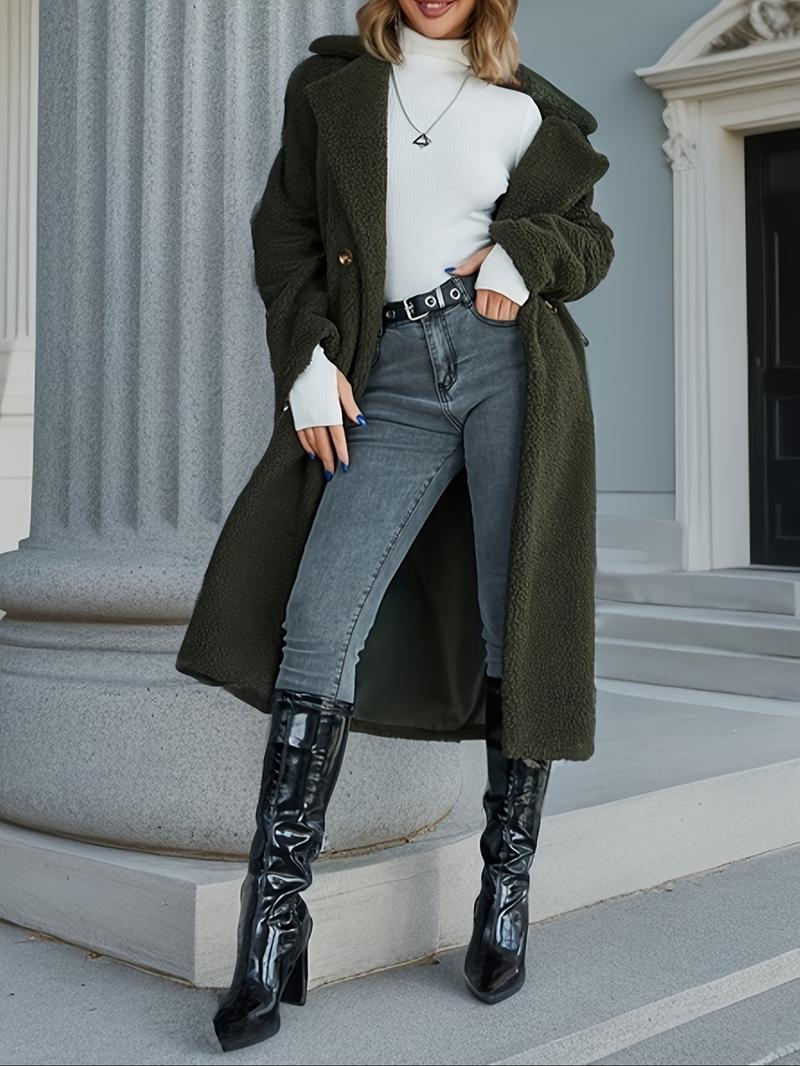 En stilren och mysig teddyrock med en lång, elegant passform som håller dig varm samtidigt som du ser modern ut. Perfekt för vardag, city-outfits och kyligare dagar.