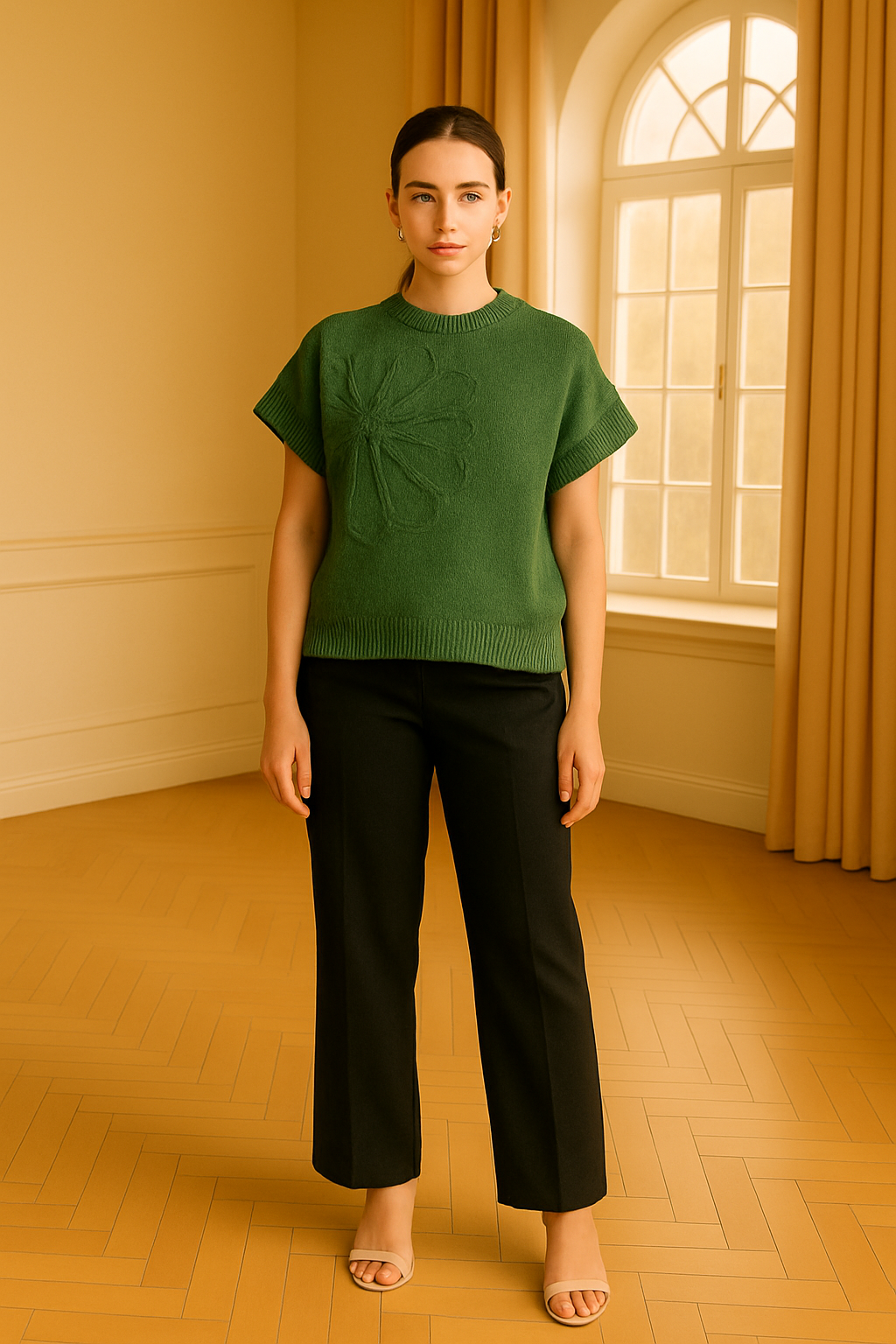 Denna gröna stickade topp med ärmlös design är både lekfull och stilfull. Det subtilt invävda blommotivet framtill ger toppen ett unikt och elegant uttryck. Tack vare den avslappnade passformen och det mjuka stickade materialet är plagget perfekt att bära både separat och lager-på-lager under en blazer eller kofta.