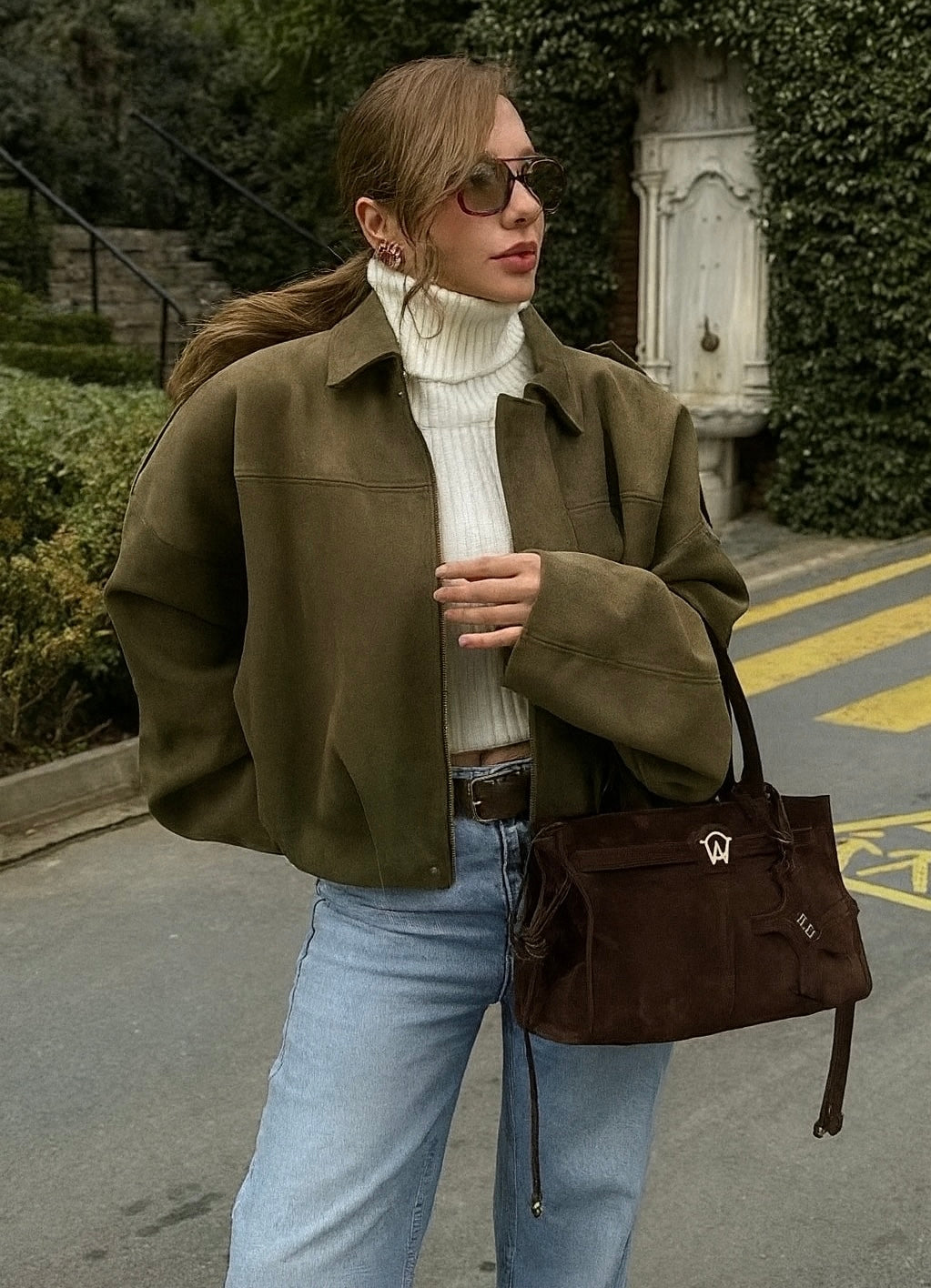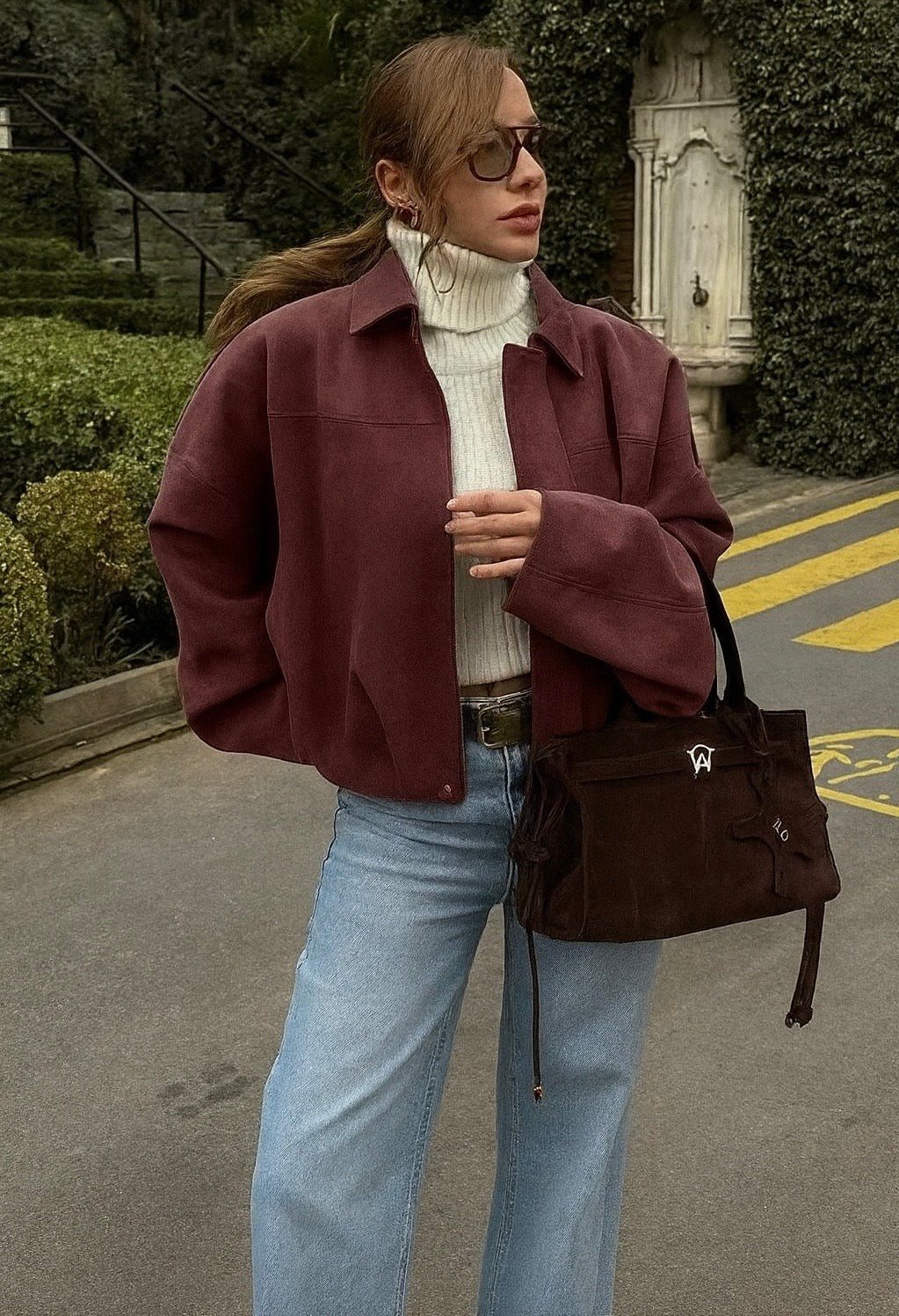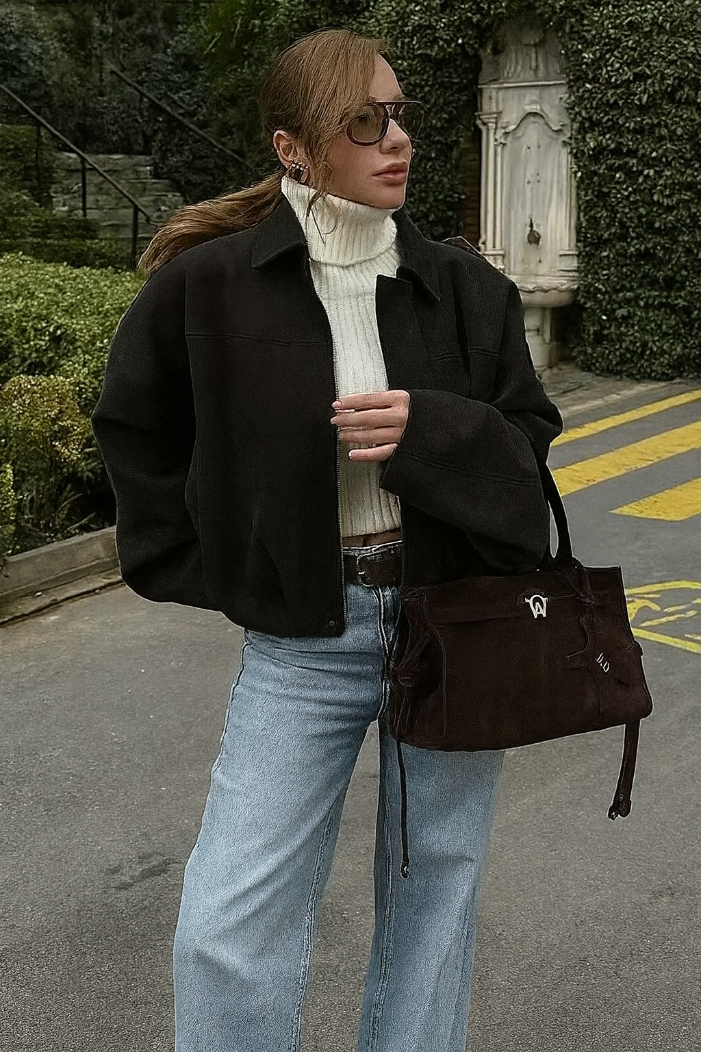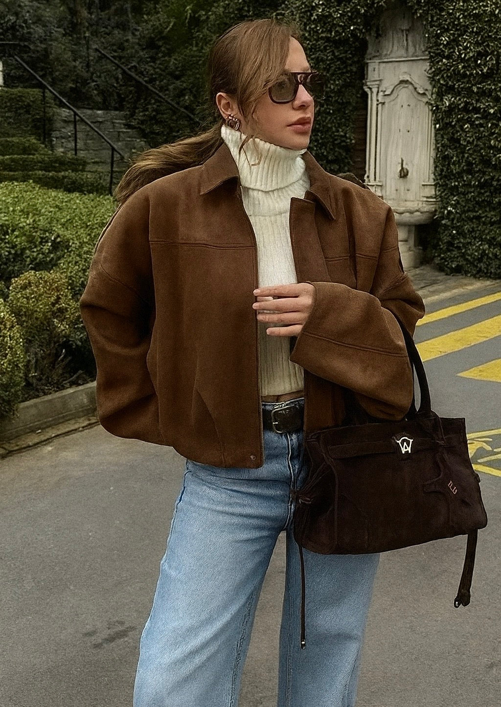 En modern och stilren jacka i mörkbrunt med mjuk känsla och avslappnad passform. Perfekt för både vardag och kväll, och enkel att kombinera med jeans, stickade tröjor och dina favoritaccessoarer.